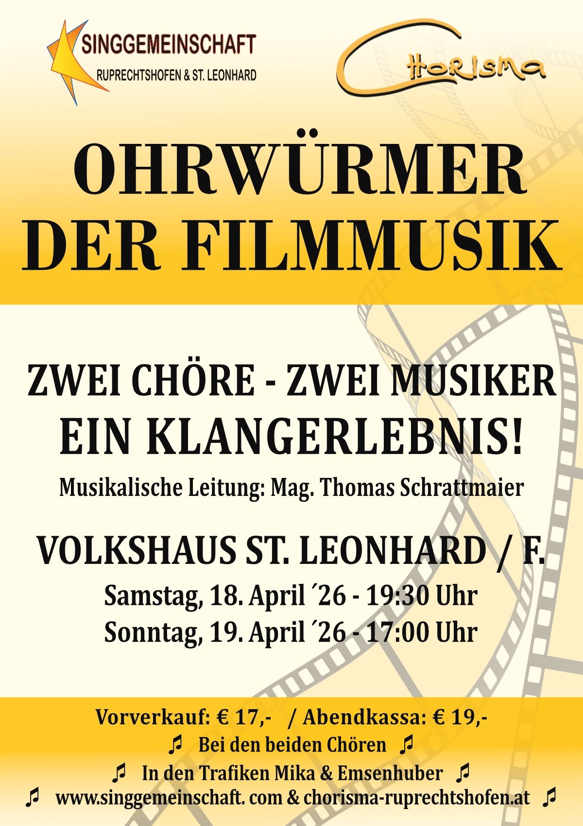 Nachfolgend finden Sie die nächsten Vorhaben der Singgemeinschaft Ruprechtshofen & St. Leonhard. Genauere Angaben wie Aufführungsort, Beginnzeiten und weitere Informationen, folgen jeweils zeitgerecht vor den Terminen!